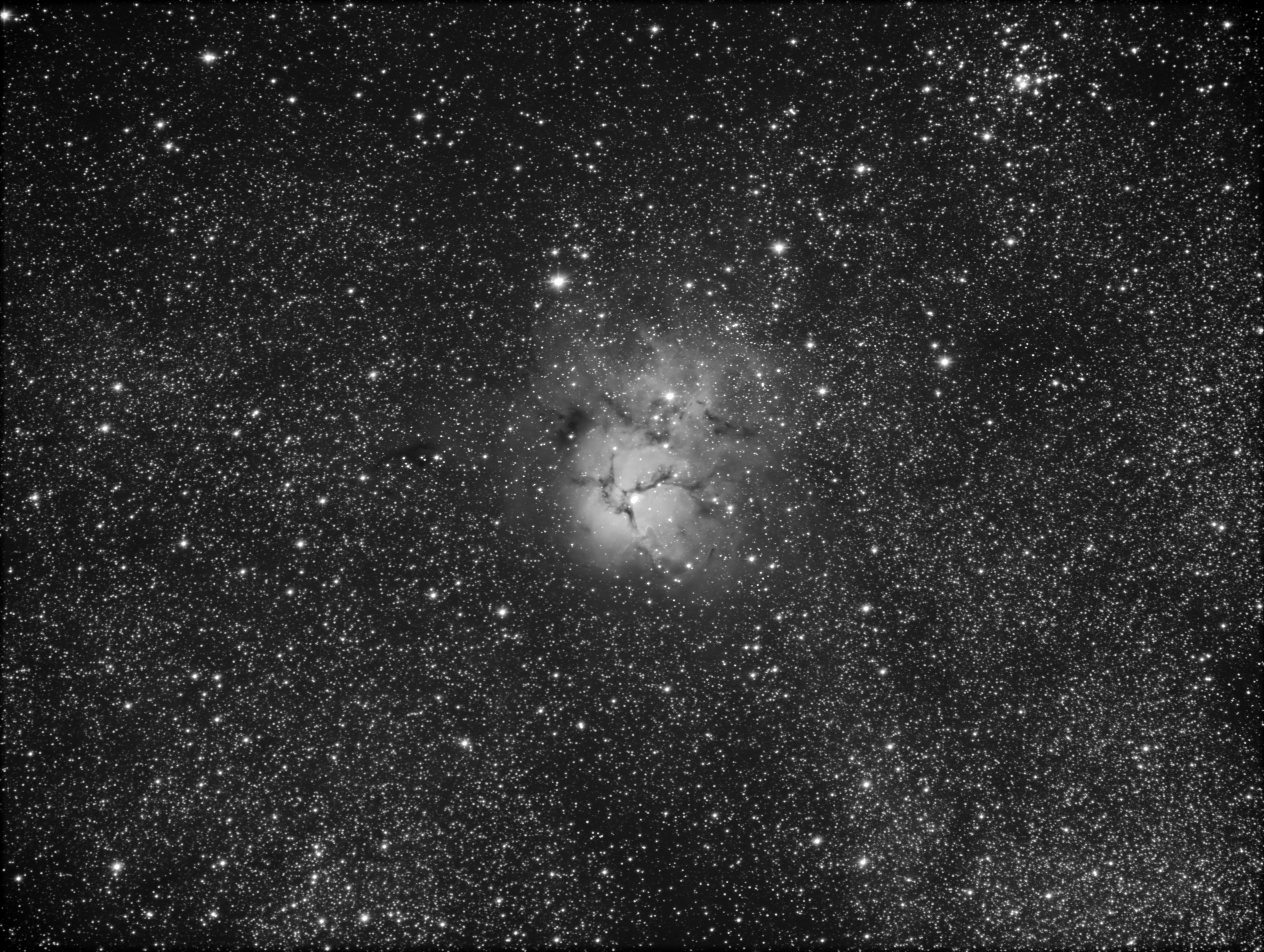 e vingtième objet du catalogue Messier (M20) est une nébuleuse diffuse située dans la constellation du Sagittaire au voisinage immédiat du bulbe central de la Galaxie. Assez connue comme une nébuleuse en émission traversée par une nébuleuse obscure digitée qui lui donne son aspect caractéristique, ses régions externes constituent en outre une nébuleuse par réflexion dont une étoile bleue relativement brillante, au nord, révèle la présence par un vaste halo diffus de même teinte centré sur cette étoile. Un système triple d’étoiles occupe le centre de la région émissive de la nébuleuse, à la manière du Trapèze de la nébuleuse d’Orion.